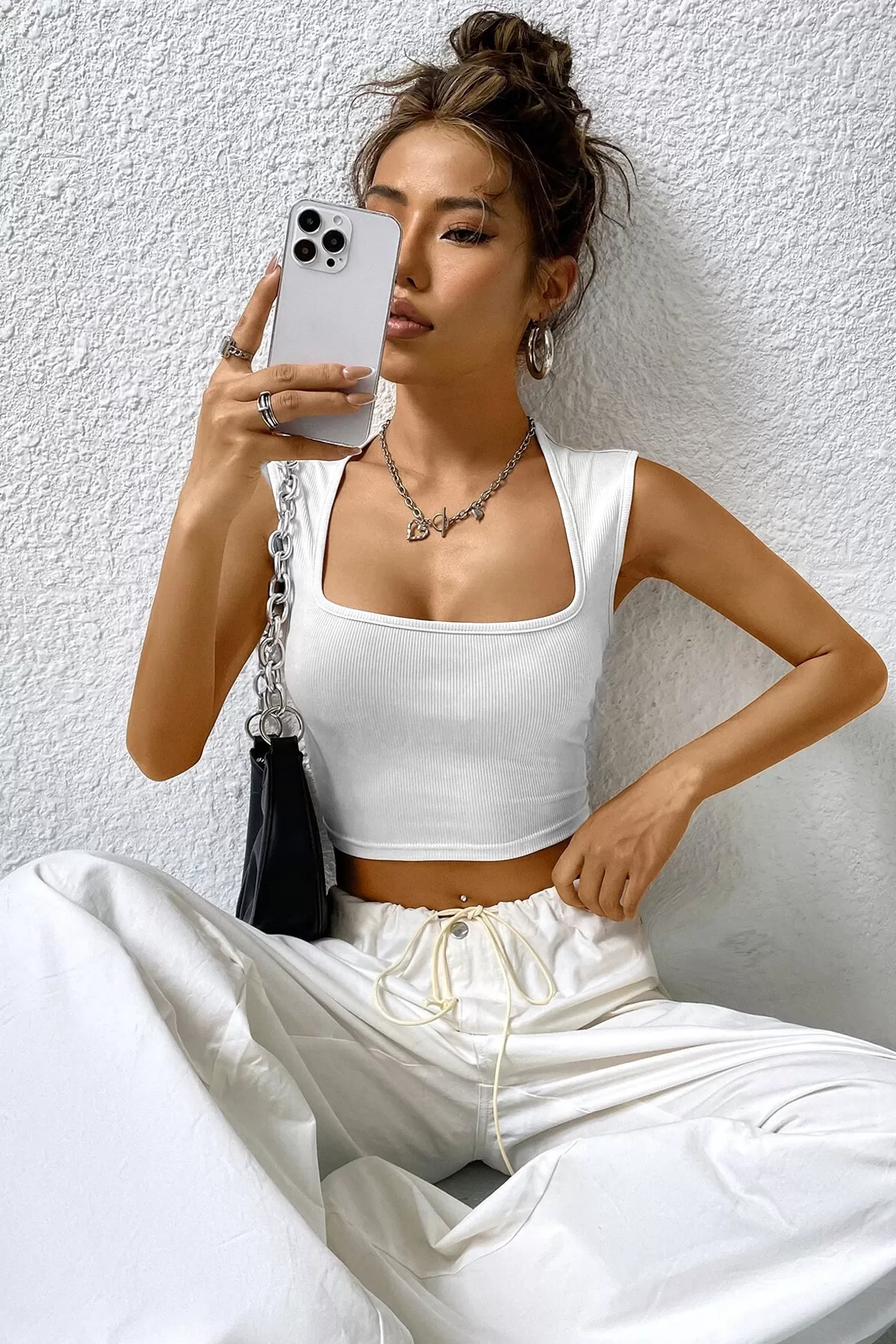 Kadın Beyaz Kare Yaka Kalınlaşan Omuz Detaylı Crop Top Bluz