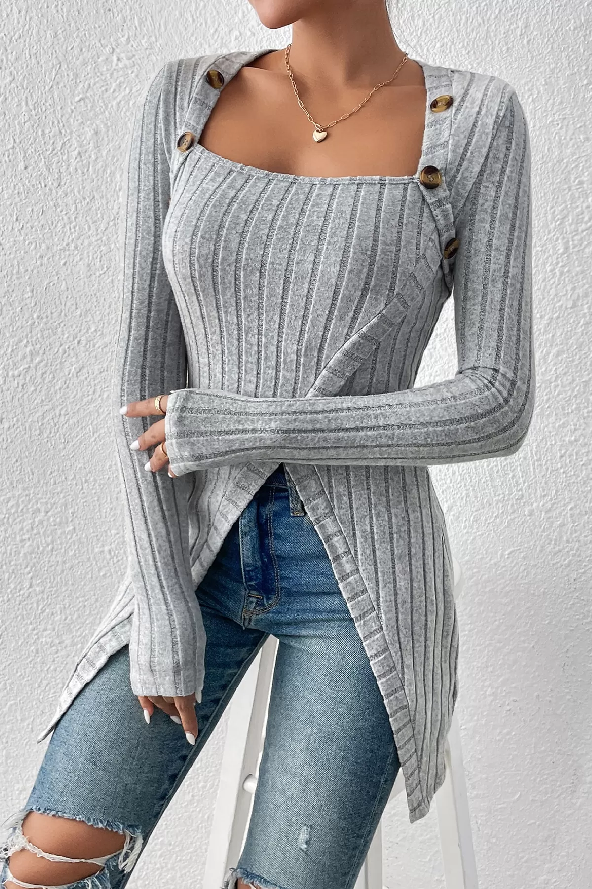 Kadın Gri Düğme Detaylı Kare Yaka Fitilli Asimetrik Etekli Uzun Kollu Bluz