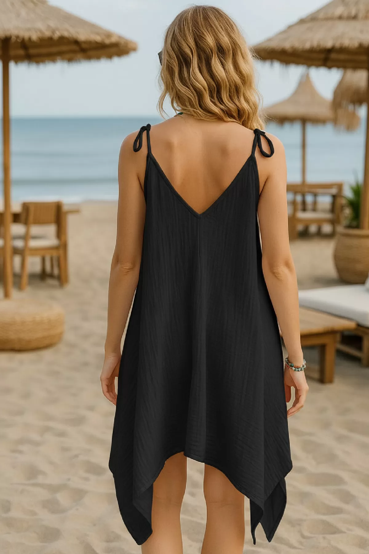 Kadın Siyah Asimetrik Kesim V Yaka Plaj Elbisesi