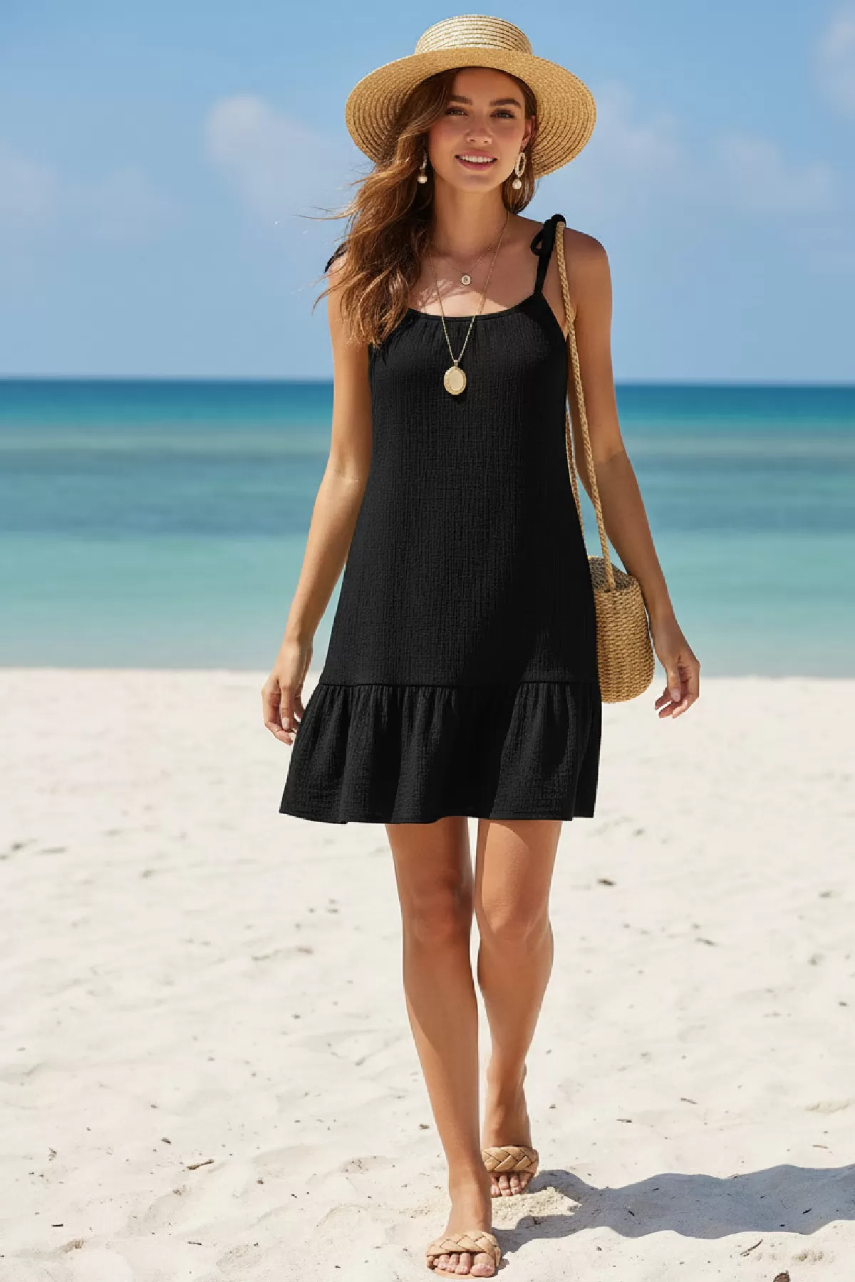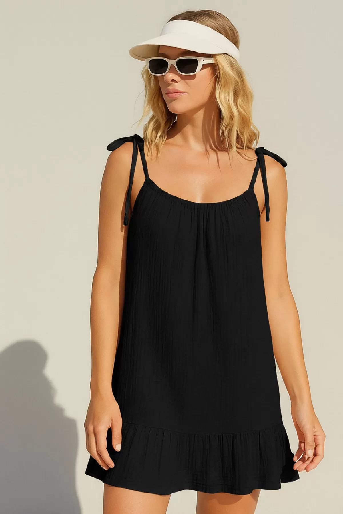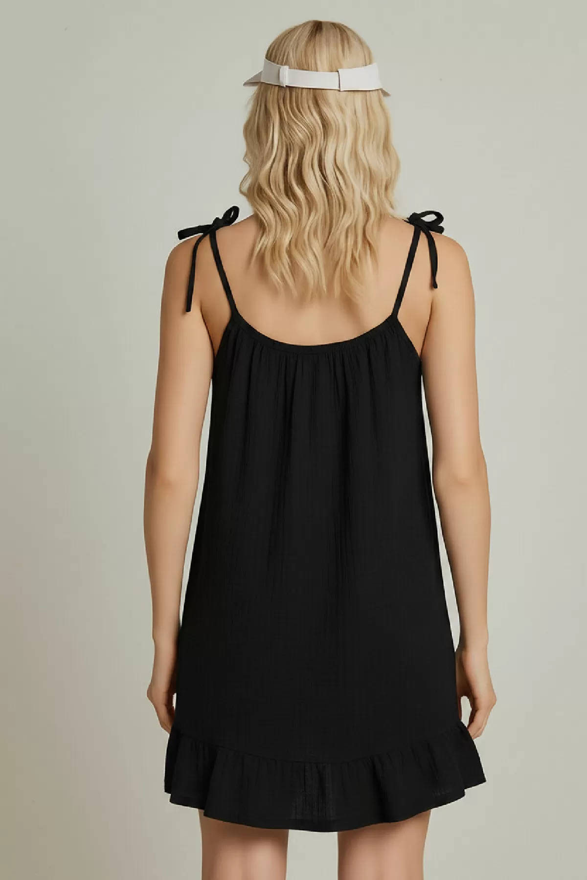 Kadın Siyah Askılı Bol Kesim Fırfırlı Plaj Elbisesi