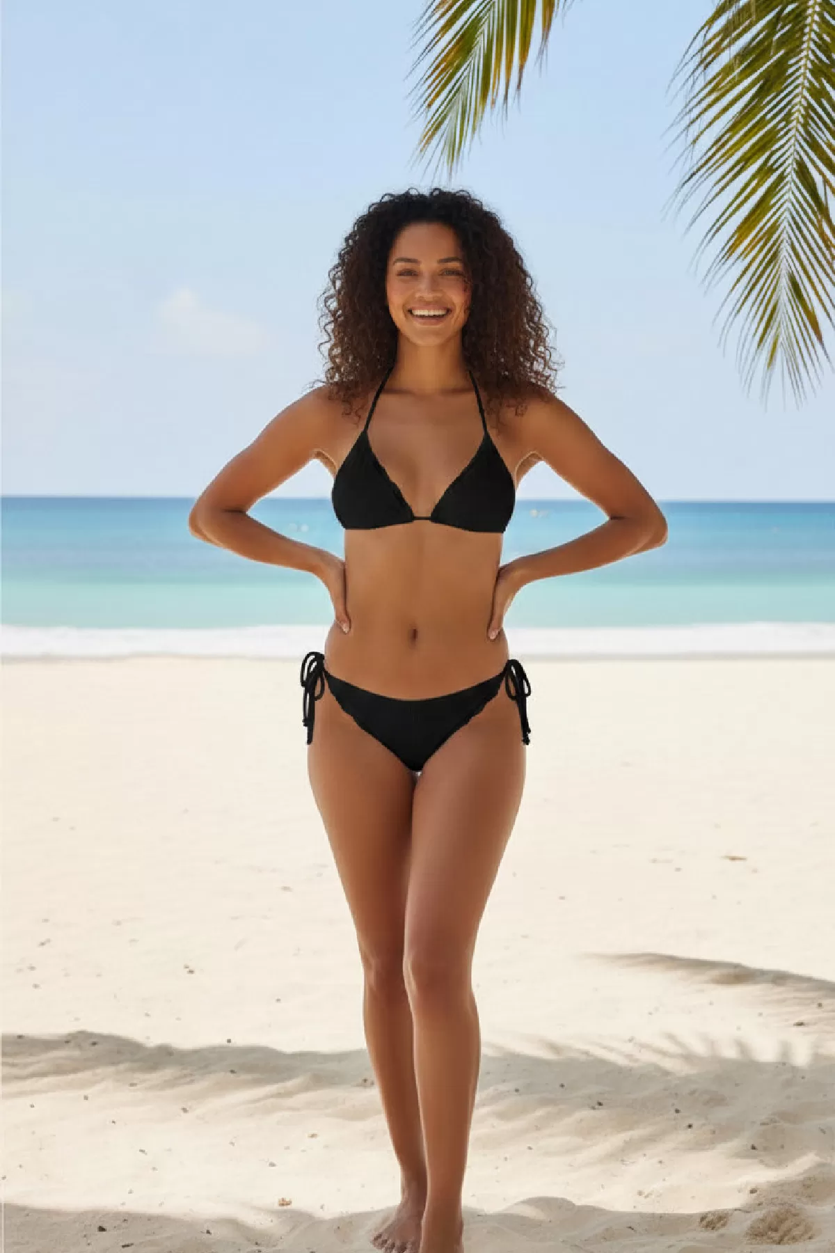 • Üçgen üst silueti, modern ve zarif bir plaj stili yaratır.